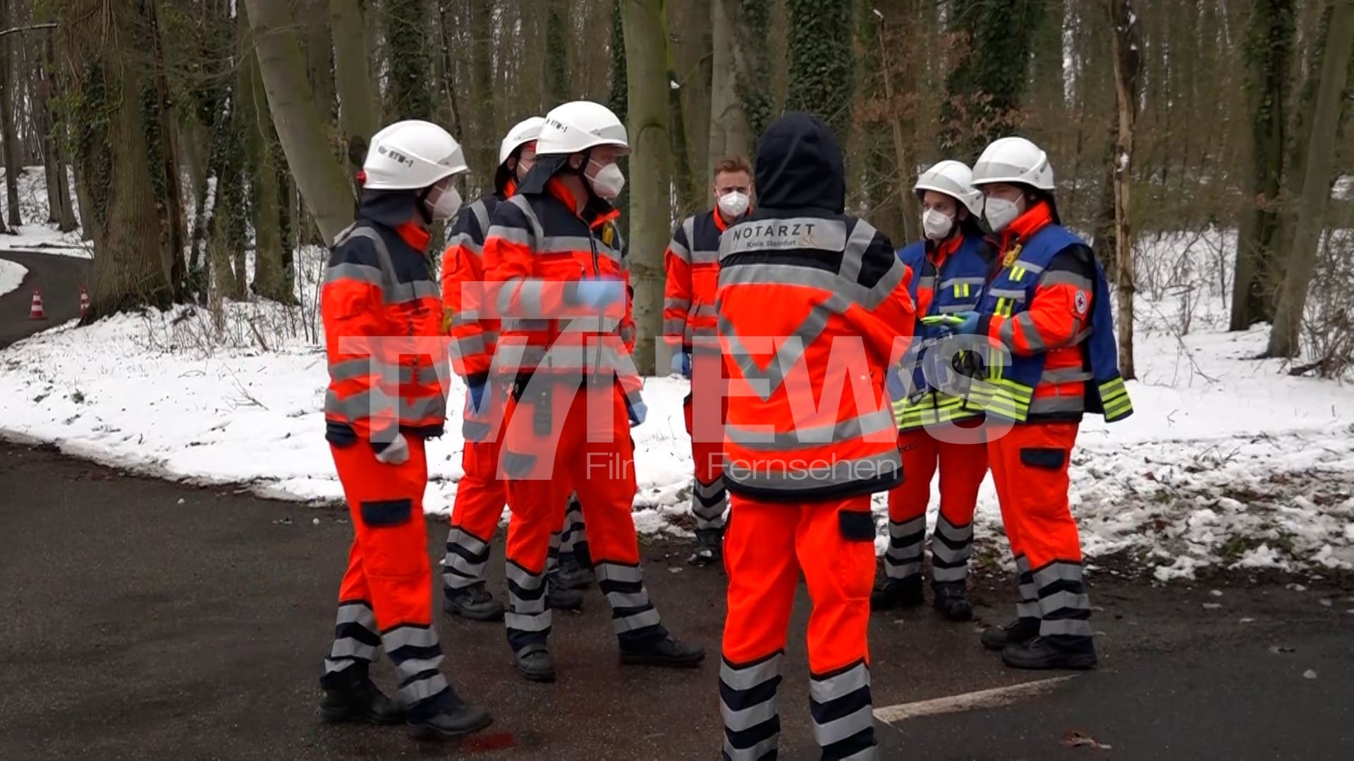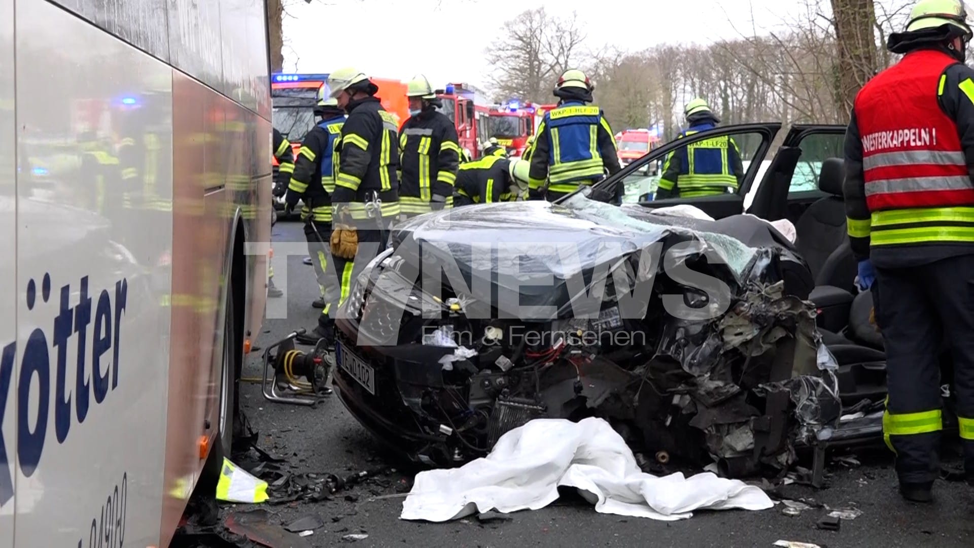 Autofahrer schwer eingeklemmt und Lebensgefahr nicht ausgeschlossen – Elf Schüler und Busfahrer von Rettungsdienst gesichtet und leicht verletzt in Krankenhäuser transportiert – Rettungskräfte im Großeinsatz – Ein Rettungshubschrauber im EinsatzUnfallursache noch unklar – Polizei hat Ermittlungen aufgenommen