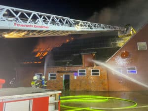 Emsdetten (NRW): 300 Quadratmeter landwirtschaftliches Anwesen in Brand: Flammenhölle tobt im Dachstuhl – Anwohnerin erleidet Rauchgasintoxikation – Feuerschein deutlich in der Nacht zu sehen – Photovoltaikanlage erschwert Löscharbeiten