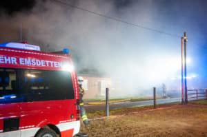 Es ist kurz vor Mitternacht, als bei der Feuerwehr ein Alarm eingeht. In Emsdetten steht ein landwirtschaftliches Anwesen mit einer Fläche von etwa 300 Quadratmetern in Brand. Das Feuer hat sich bereits ausgebreitet und die Flammenhölle tobt im Gebäude. Selbst aus der Ferne ist der Feuerschein in der ländlichen Gegend gut zu erkennen. Ein Anwohnerin hat eine Rauchgasintoxikation erlitten, der Rettungsdienst bringt sie zur weitern Behandlung in ein Krankenhaus. Die drei restlichen Bewohner des angrenzenden Wohnhauses bleiben zum Glück unverletzt.