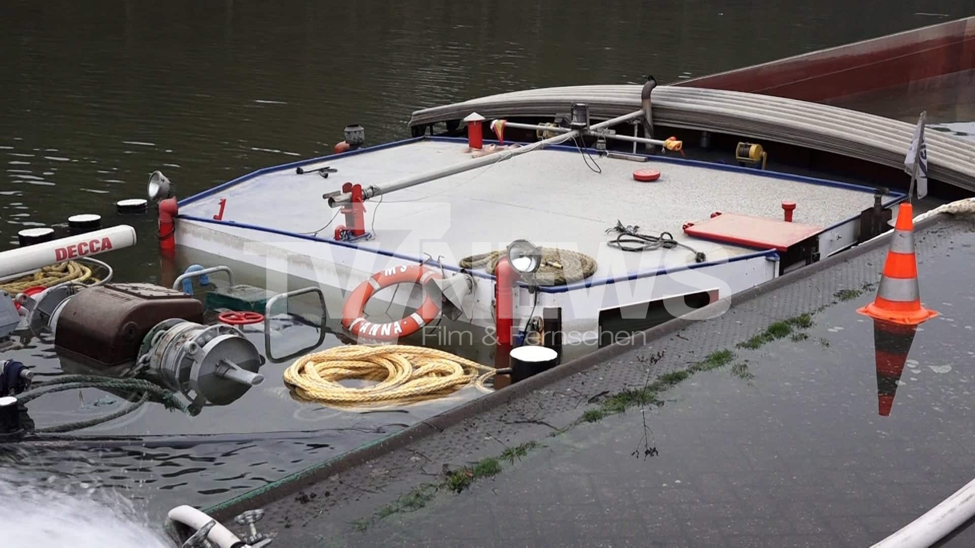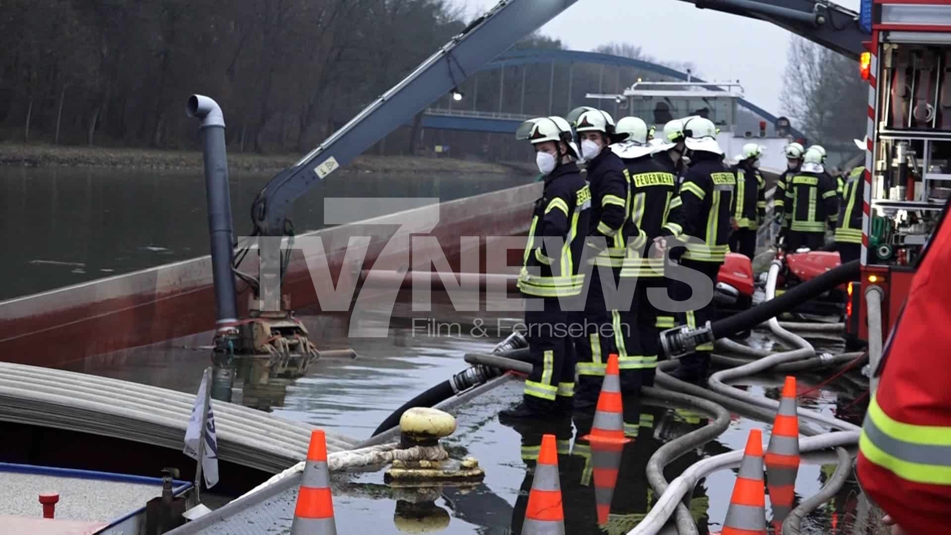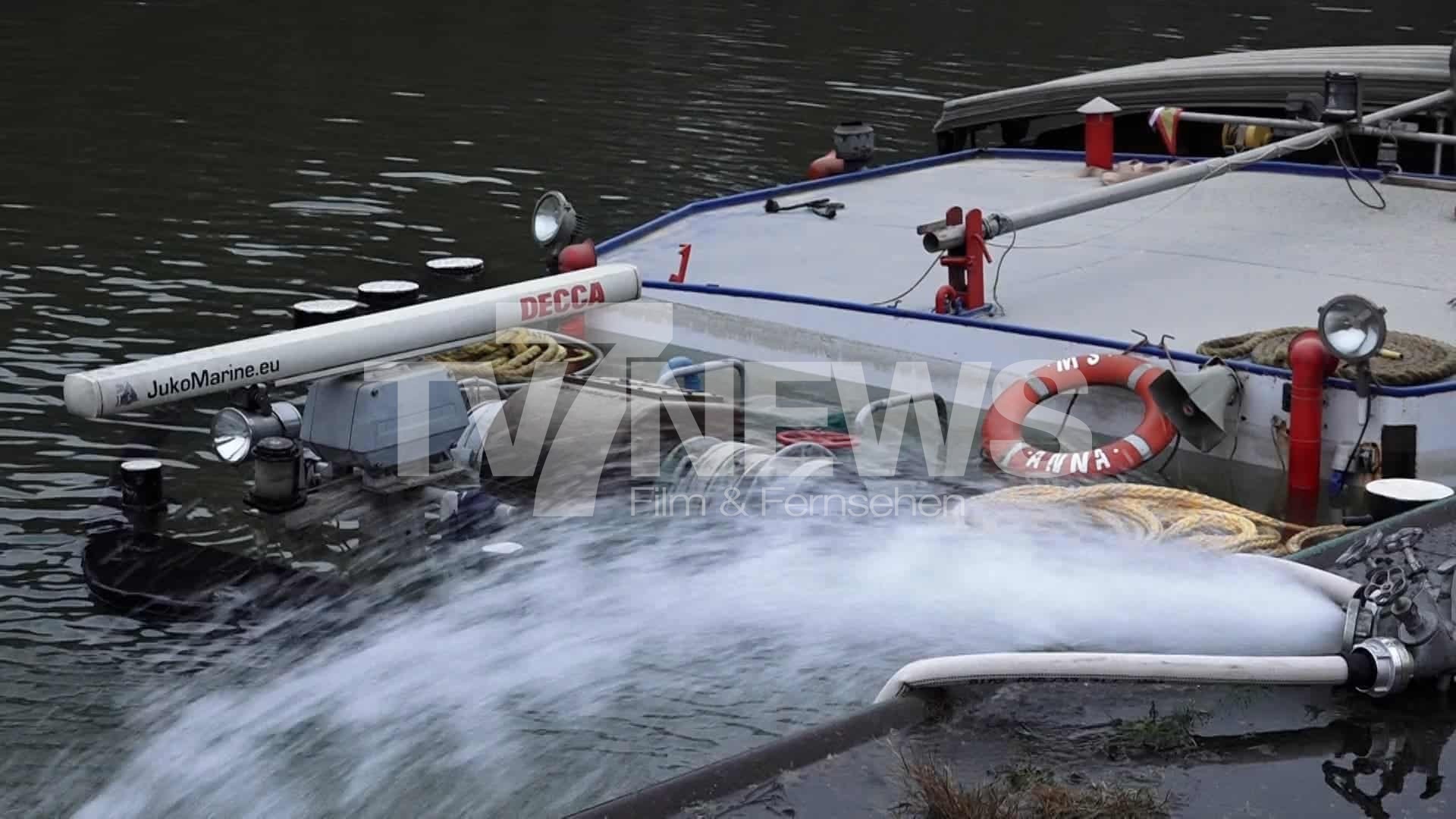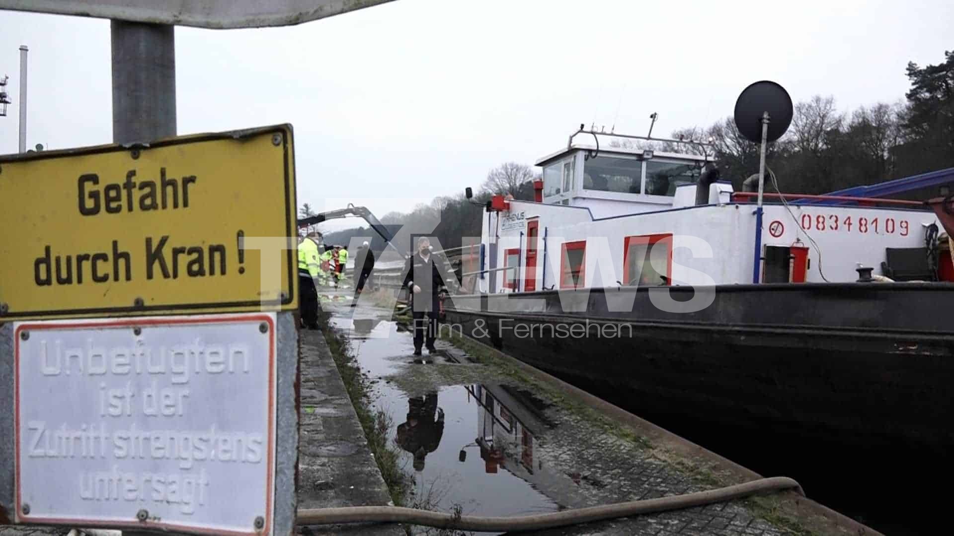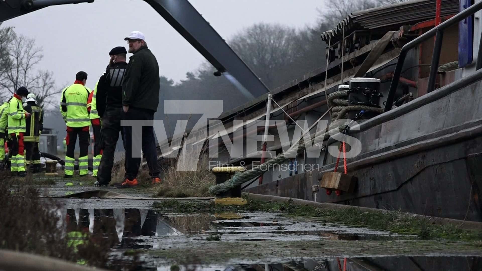 „Anna“ bereits zur Hälfte unter Wasser – Kapitän hatte am Montagabend angelegt – Hochleistungspumpen mit Baggerschaufel in sinkendes Schiff geladen – 700 Liter Schiffsdiesel drohen in den Dortmund-Ems-Kanal zu laufen – Bereits Ölschicht auf Wasser gebildet durch 30 bis 40 Liter Öl – Feuerwehr bringt Ölsperren aus – Kommandant der Feuerwehr hat so etwas in den letzten 30 Jahren nicht erlebt