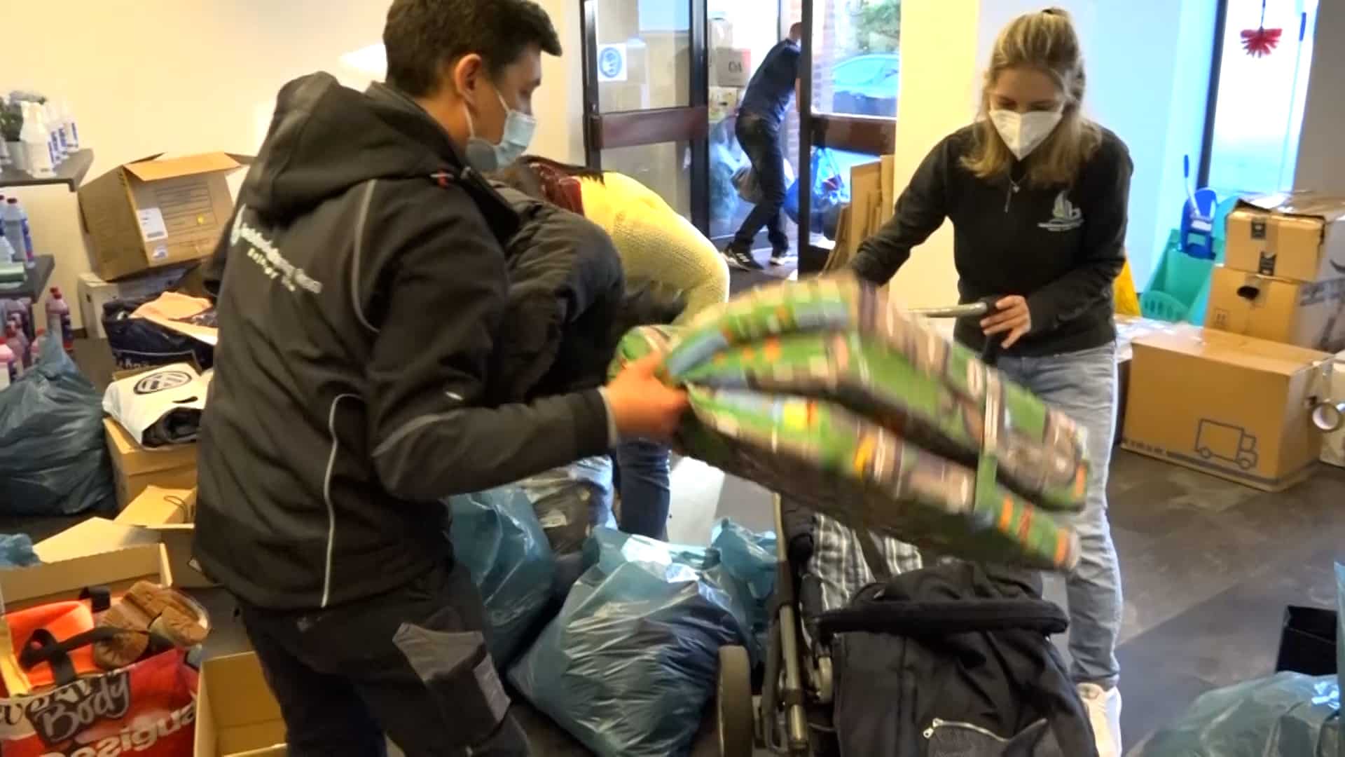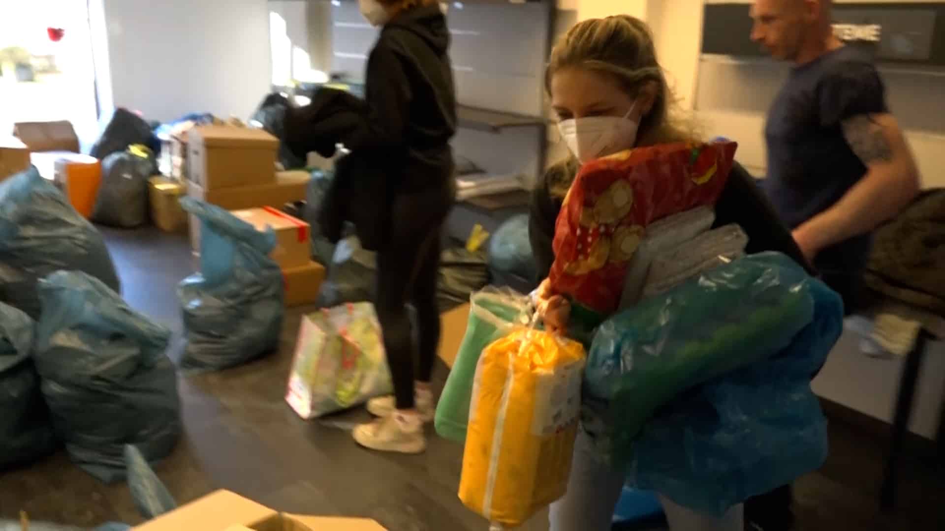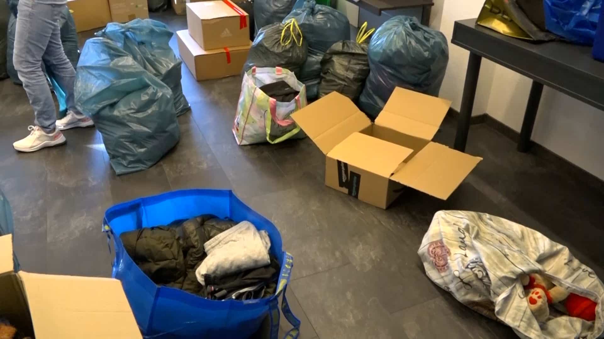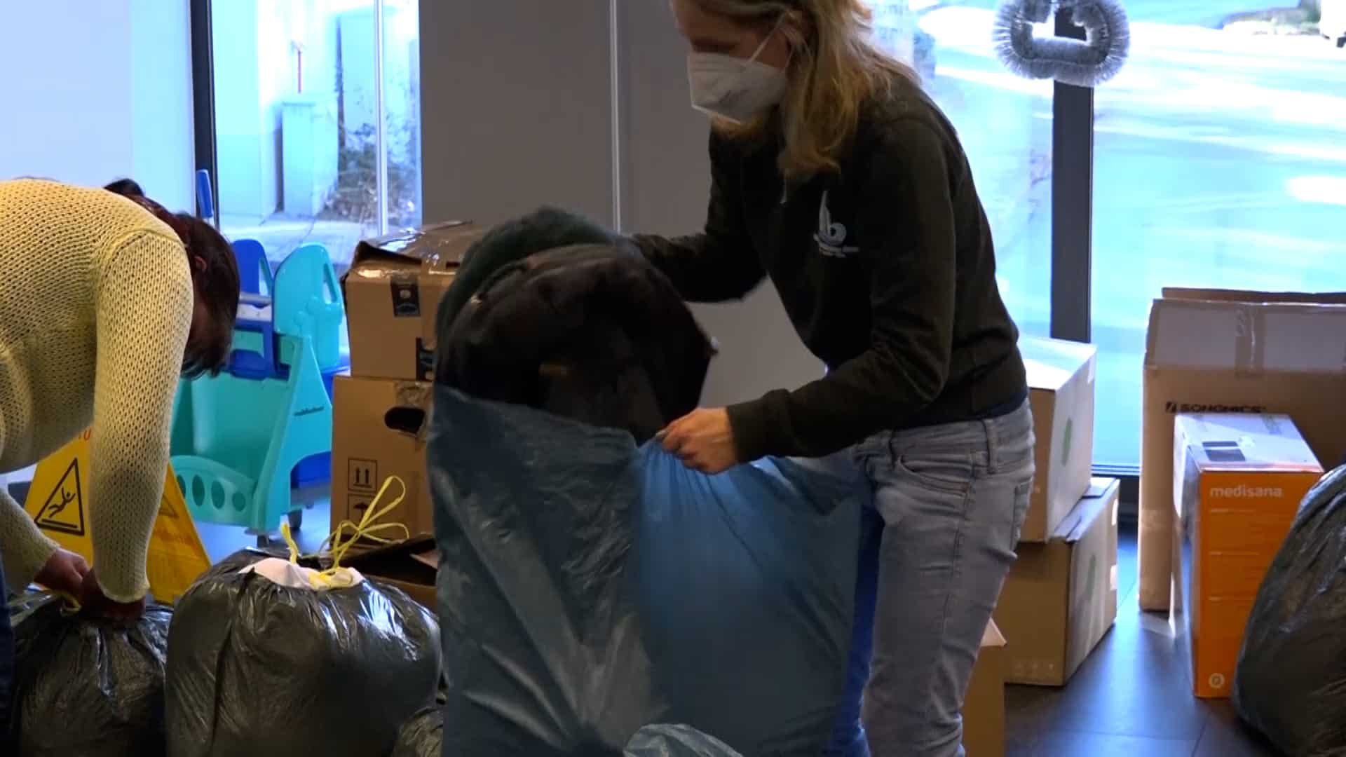 „Es sind Schuhe, es sind warme Kindersachen, Damenkleidung, Herrenkleidung, es sind Konserven, es sind Masken, auch unter anderem, gerade durch Corona noch, PCR-Tests, Desinfektionsmittel, Verbandskästen, all das, was dort benötigt wird, kommt dort an“, so Pauline weiter. „Wir haben sofort zusammengesucht, wo wir es gelesen haben. Ja, auf jeden Fall, man kann ja sonst nicht viel machen und ich finde, das ist schon eine gute Sache“, erklärt Nadine, die Sachen abgegeben hat. „Wir haben Desinfektionsmittel gebracht, Decken, warme Kleidung, Kinderkleidung, Masken, ein bisschen Spielzeug und von allem ein bisschen und weil man damit etwas Gutes tun kann und man froh ist mit so was, ein bisschen zu unterstützen“, so Nadine weiter.