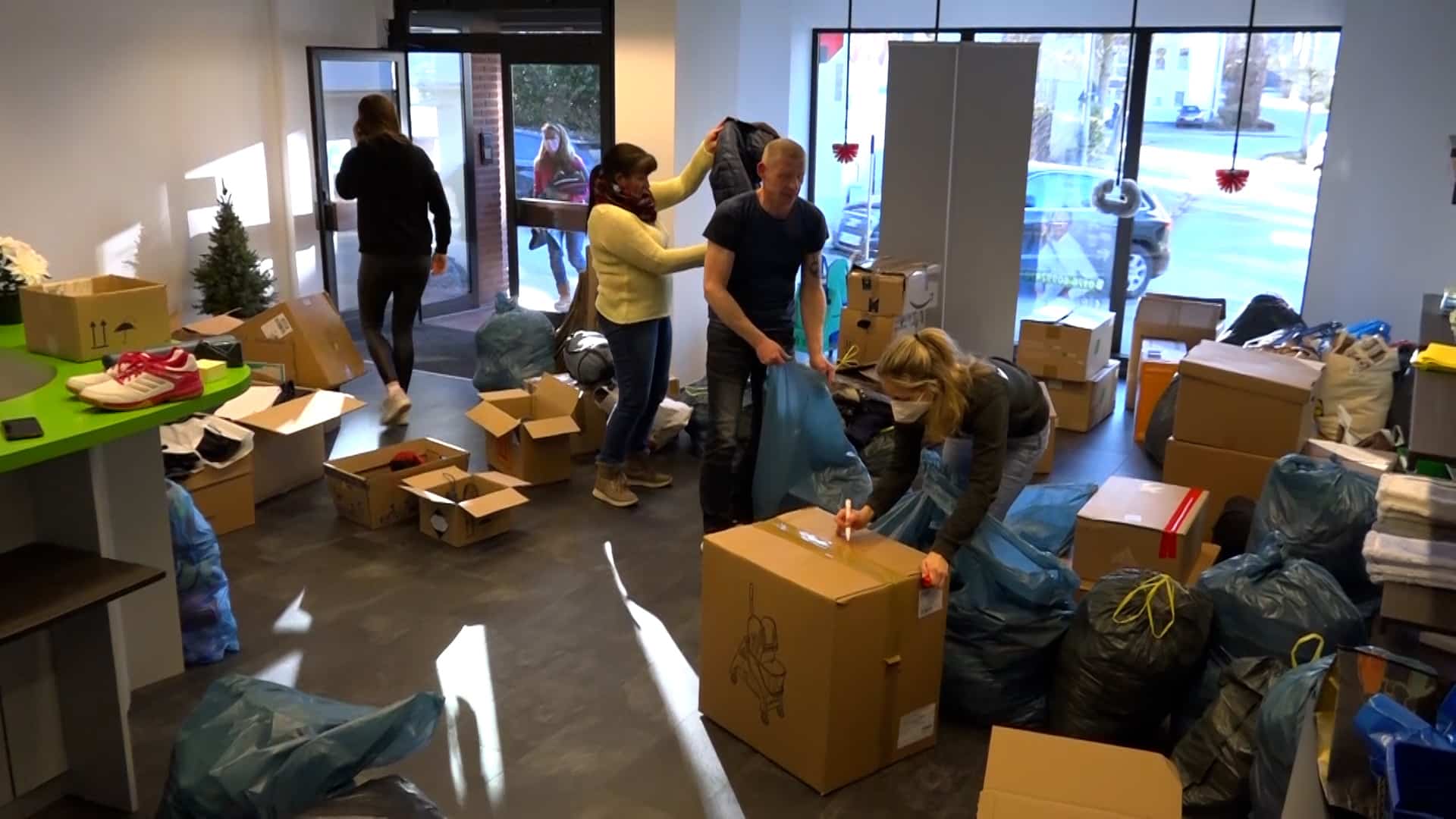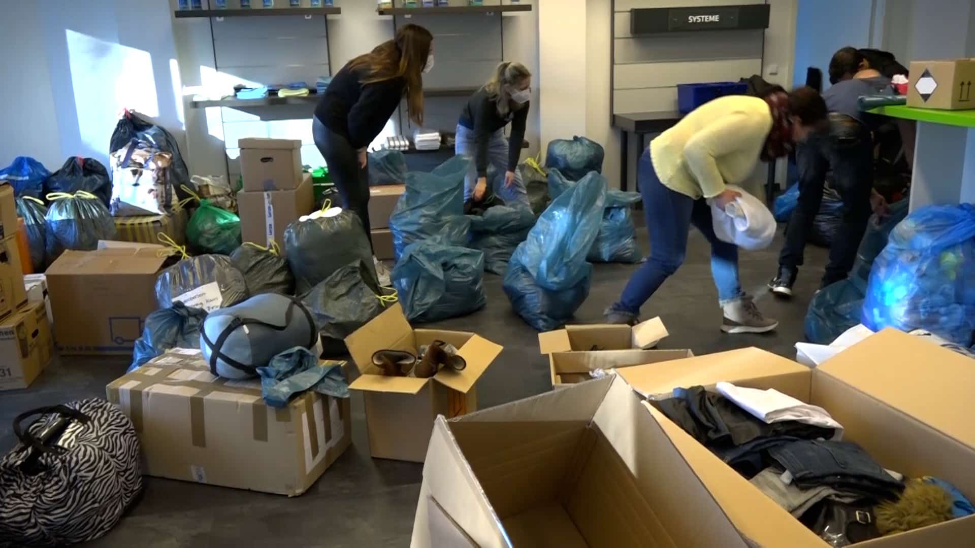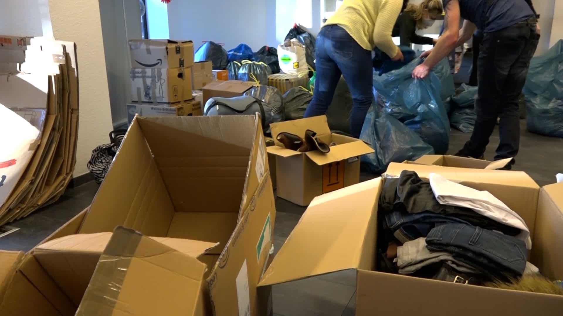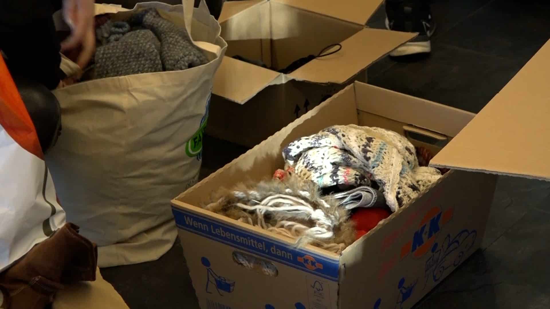 „Es sind Schuhe, es sind warme Kindersachen, Damenkleidung, Herrenkleidung, es sind Konserven, es sind Masken, auch unter anderem, gerade durch Corona noch, PCR-Tests, Desinfektionsmittel, Verbandskästen, all das, was dort benötigt wird, kommt dort an“, so Pauline weiter. „Wir haben sofort zusammengesucht, wo wir es gelesen haben. Ja, auf jeden Fall, man kann ja sonst nicht viel machen und ich finde, das ist schon eine gute Sache“, erklärt Nadine, die Sachen abgegeben hat. „Wir haben Desinfektionsmittel gebracht, Decken, warme Kleidung, Kinderkleidung, Masken, ein bisschen Spielzeug und von allem ein bisschen und weil man damit etwas Gutes tun kann und man froh ist mit so was, ein bisschen zu unterstützen“, so Nadine weiter.