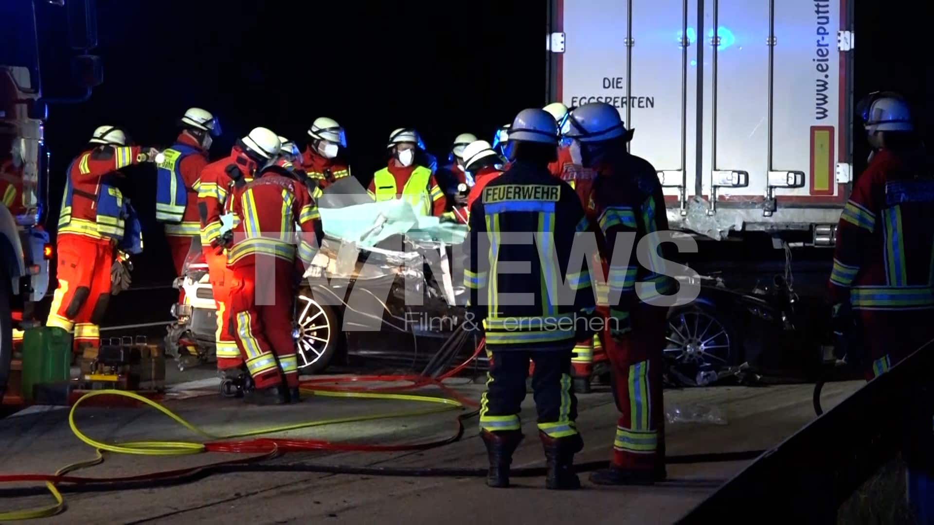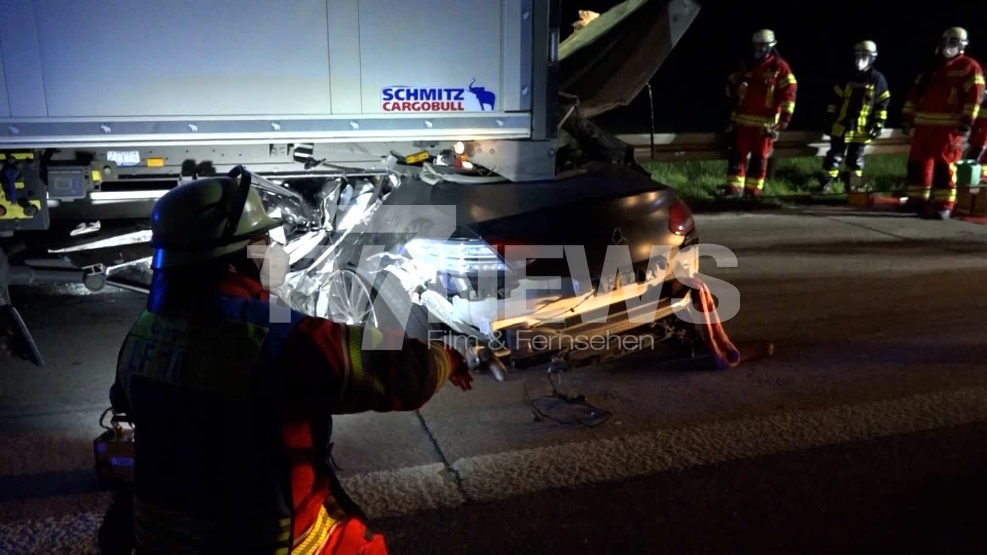 C-Klasse hängt quer unter Lastwagenheck und wird noch 500 Meter mitgeschleift – Insassen haben aufgrund Unfallmechanismus keine Überlebenschance im Fahrzeugwrack – Feuerwehr hat belastende Aufgabe die Leichname zu bergenStoßstange liegt mehrere hundert Meter von den Unfallfahrzeugen entfernt – Hergang des Horrorcrash noch unklar – VU-Team der Polizei ermittelt zur Ursache
