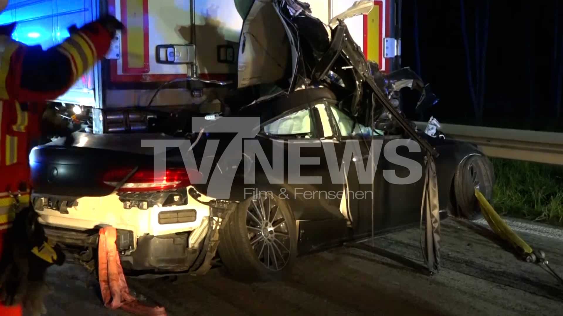 Es ist kurz vor MItternacht am Sonntagabend, als zwei Männer mit einer Mercedes C-Klasse auf der A1 unterwegs sind. Was dann passiert ist noch unklar. In der Folge steckt die Limousine jedoch quer unter dem Heck eines Lastwagens und wird noch rund 500 Meter mitgeschleift, bevor der Lkw zum Stehen kommt.