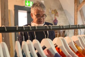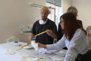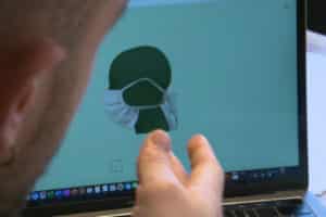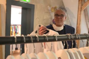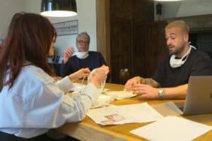 Trotz der Umstellung galt es der Firma treu zu bleiben, mit natürlichen Stoffen und effizient zu arbeiten. Aus der Menge Stoff, aus der früher eine Bluse entstand, fertigen die Näherinnen nun 50 wiederverwendbare Masken. Alles aus vorhanden Leinenstoffen, die allerdings keinen Färbeprozess durchlaufen und nur in weiß auf dem Markt sind. Allerdings gibt es eine “do it yourself“ Anleitung zum Zuhause färben. Im Team haben Thomas Welzel, Philipp Welzel und Anke Küpper-Welzel besprochen, wie sie die wiederverwendbaren Masken konstruieren wollen. Das firmeninterne Knowhow war dabei natürlich eine große Hilfe und so entwickelte sich schnell ein Prototyp zur heutigen Maske – mit Bändern, damit sie jeder individuell auf sich einstellen kann. Allen Dreien ist es wichtig etwas sinnvolles in dieser schweren Zeit zu leisten. „Das hilft uns, das hilft unseren Mitmenschen, wir schützen uns gegenseitig, vor dem gefährlichen Virus, wenn wir diese Masken tragen“, so der Geschäftsführer.